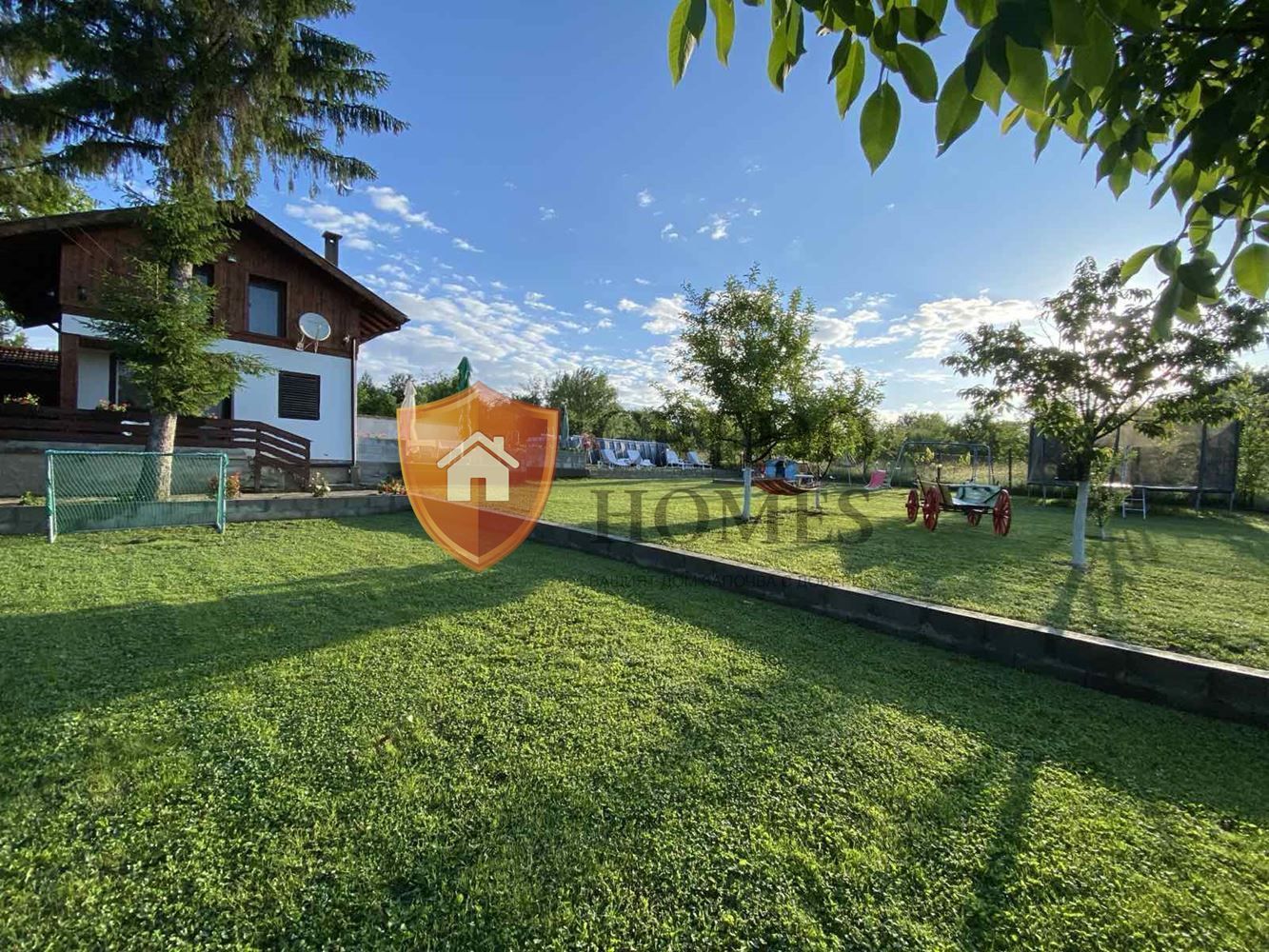 Дворът е 600 кв.м, прекрасно поддържан, с тревни площи и овощни дървета, създаващи усещане за спокойствие и хармония с природата.
